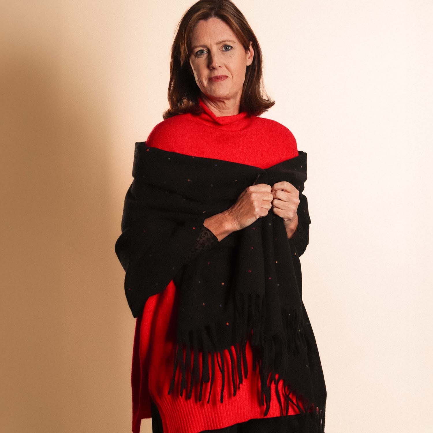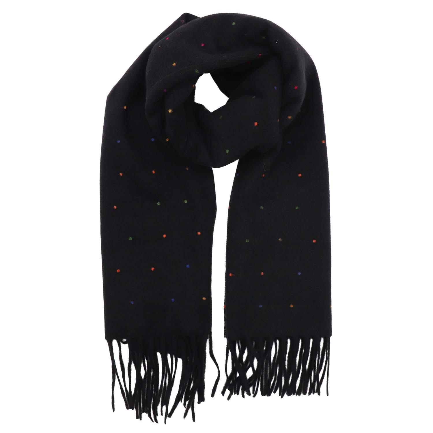 Add a hint of warmth to your style with this cosy scarf, featuring multi coloured spots and a fringed edge.