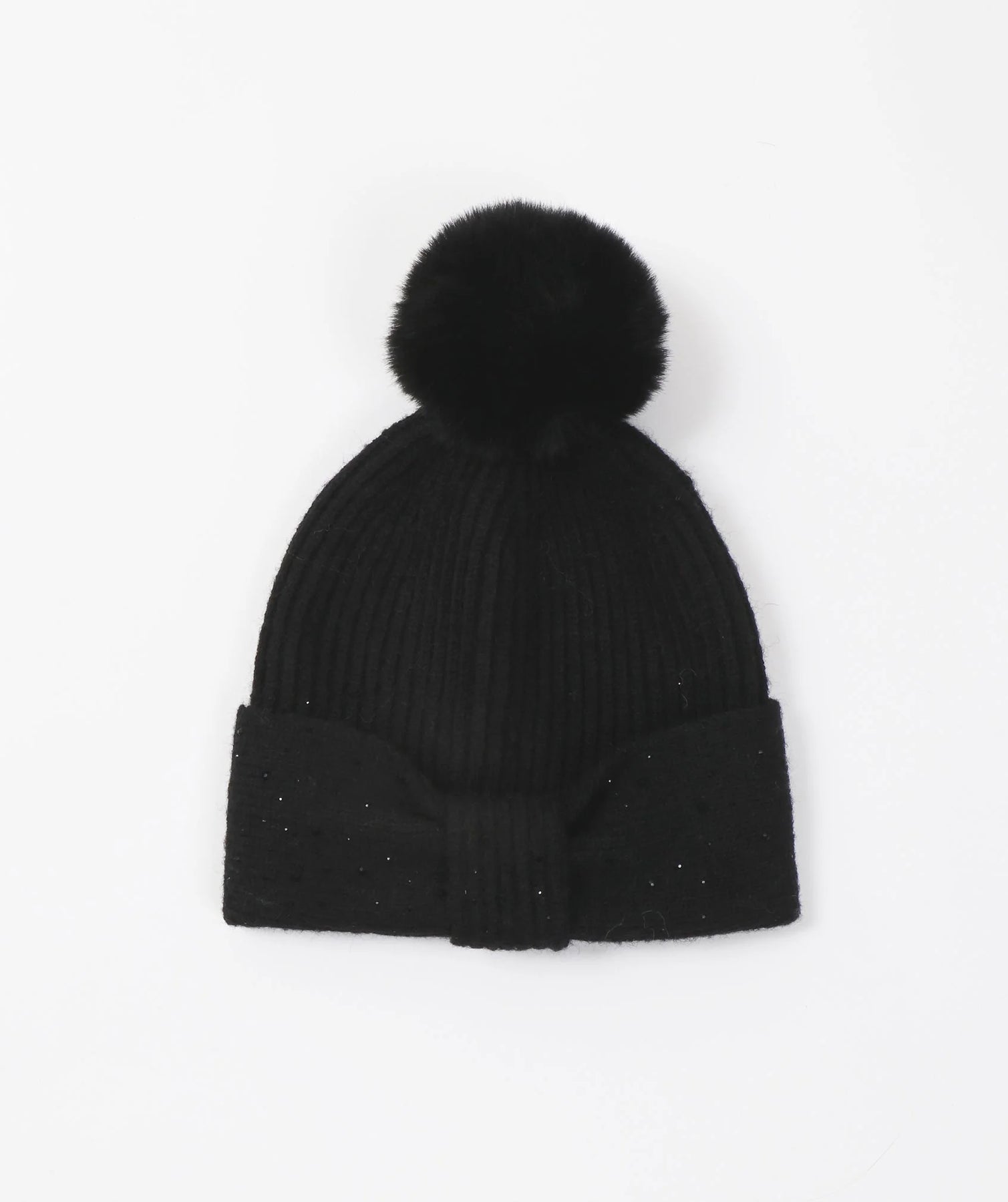 For those who like keeping things simple without being plain, Drew is a knitted beanie hat with subtle design details. The ribbed body of this beanie offers texture and is topped with a matching black faux fur pom pom. Playful and casual this beanie hits all the right notes. An embellished rhinestone bow in all black then adds that subtle sparkle. Genius!