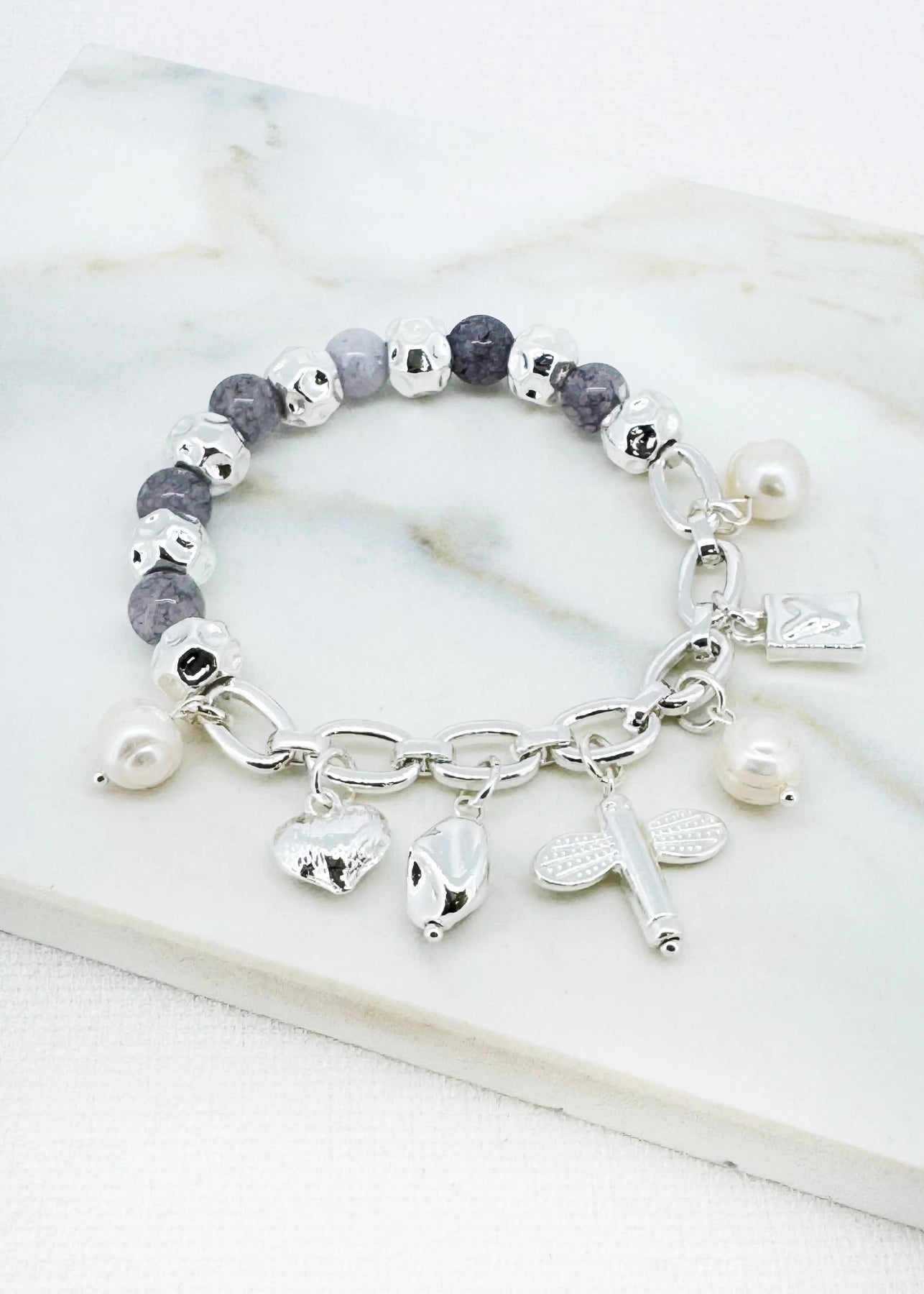 Elasticated Silver and grey ball charm bracelet
