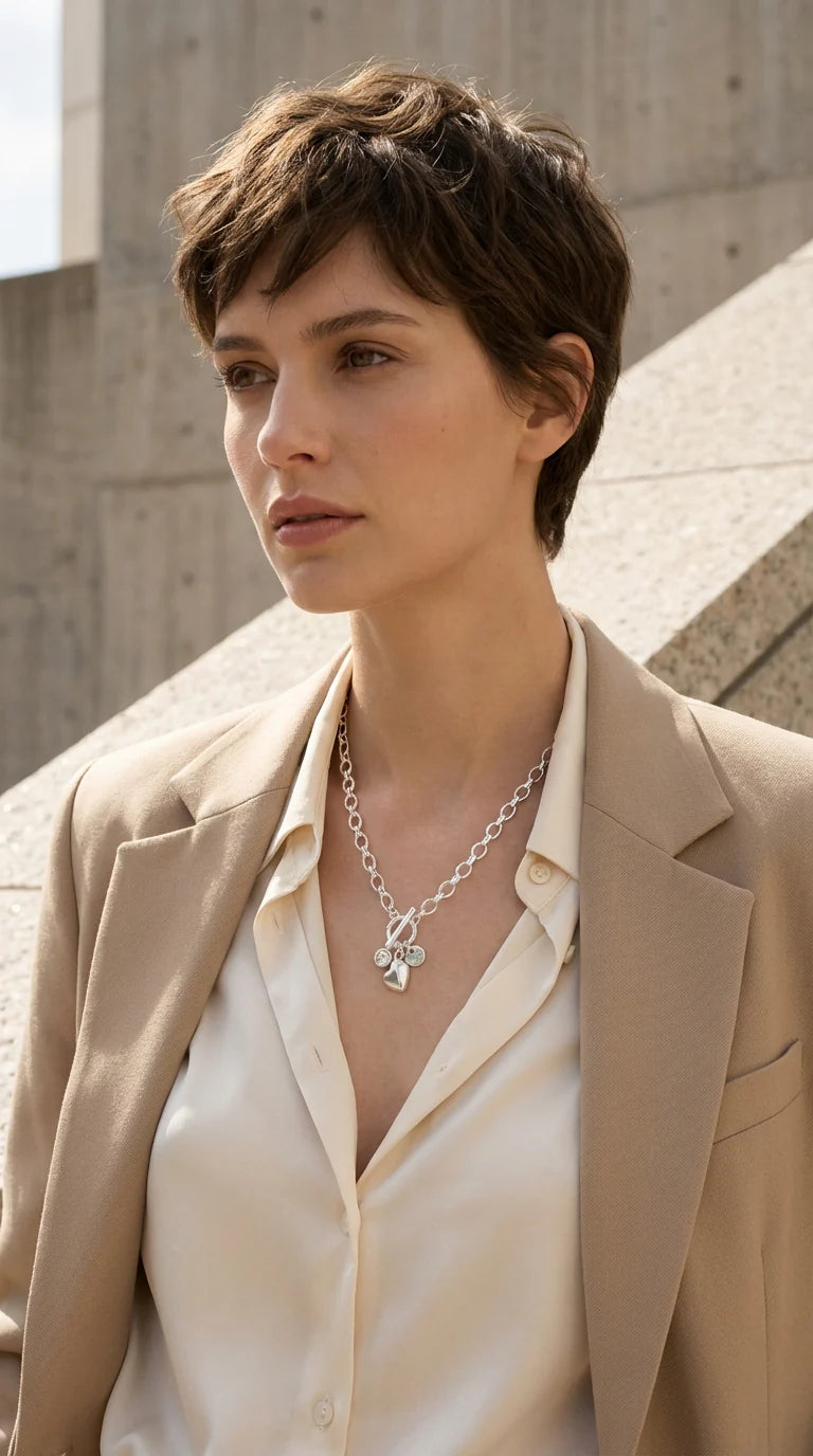 Short silver link T-bar and charm necklace