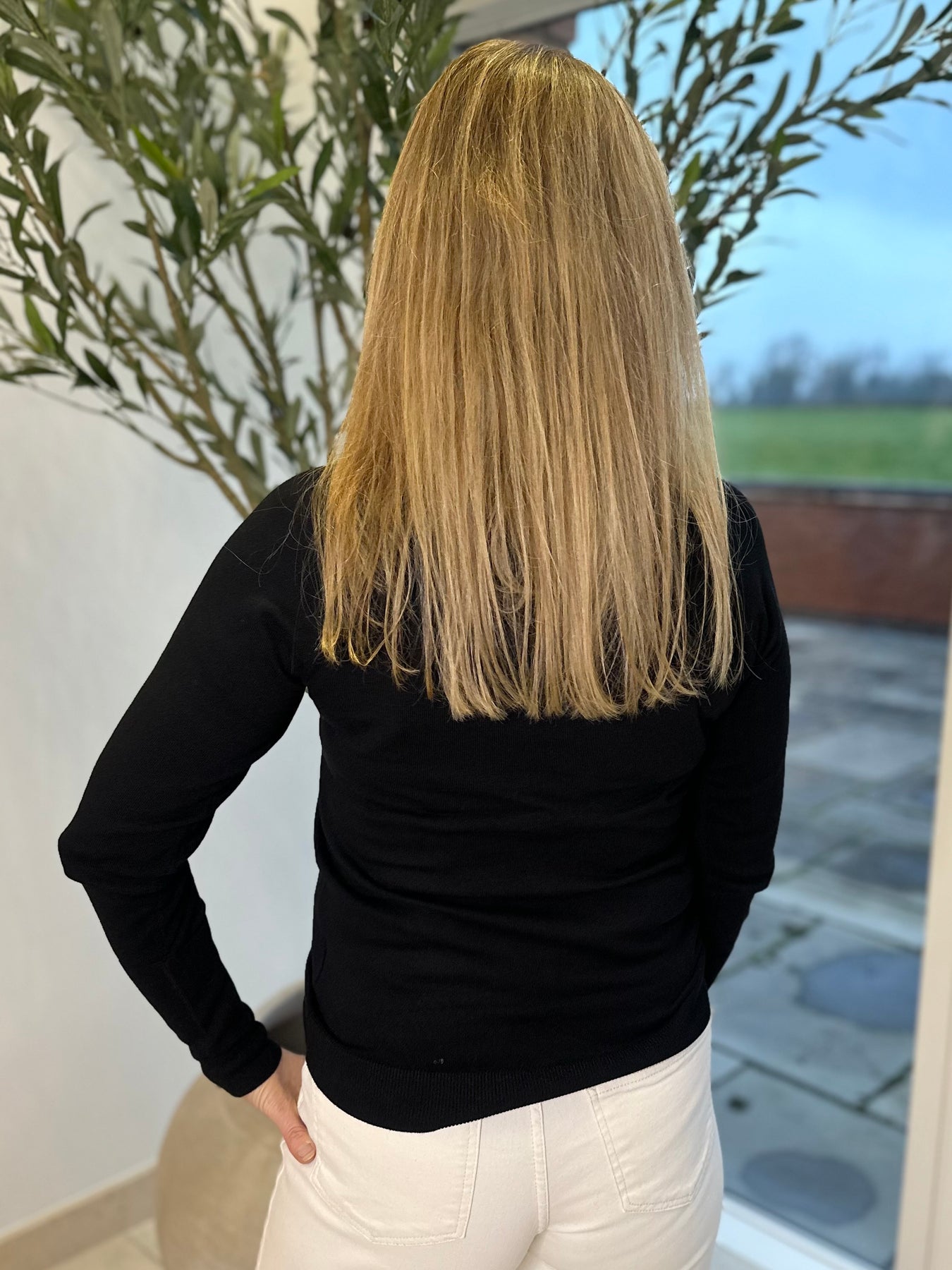 Black soft knitted top by Byoung with rounded neckline and sleeves with a long cuff.
