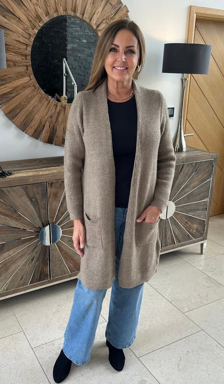Knitted mid length cardigan by ONLY in caribou with long sleeves and patch pockets to the front.