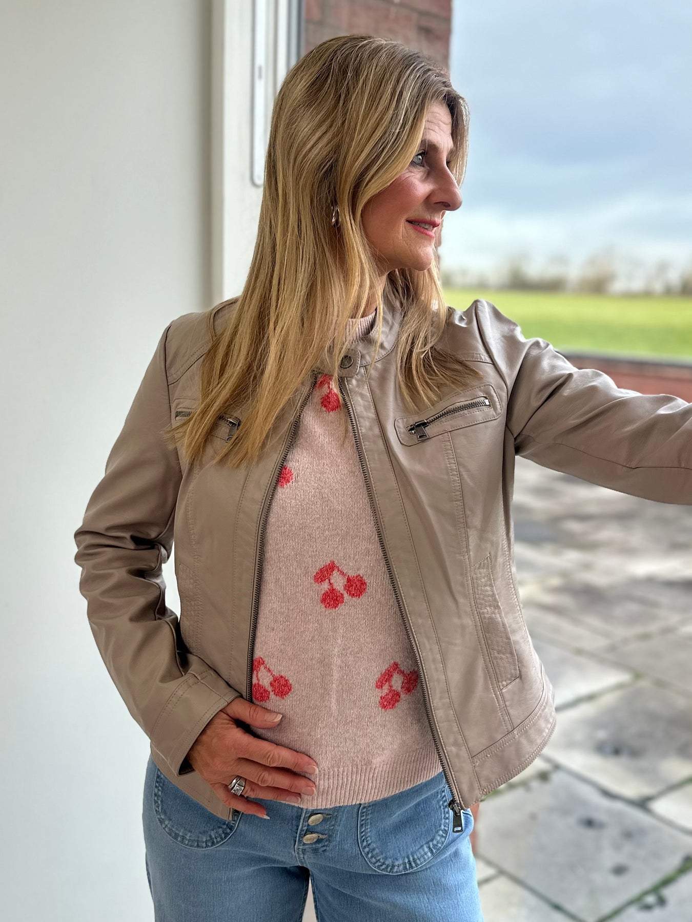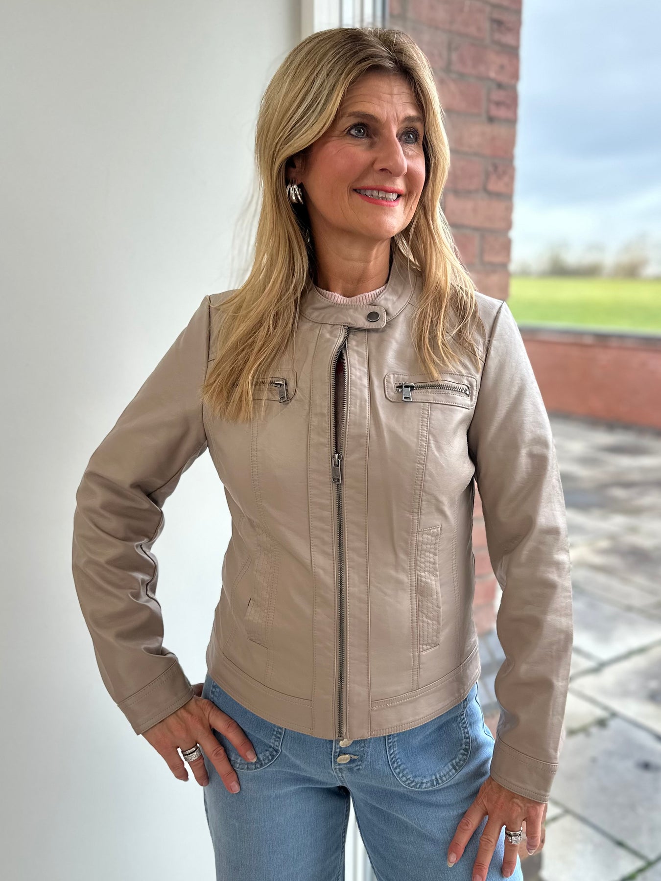 Faux leather biker jacket by ONLY in stone with zip fastening and pockets.