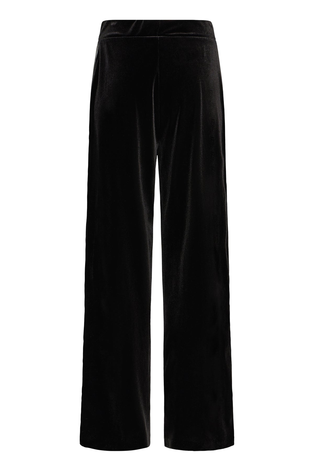 Black velour trousers with satin stripes down the sides, comfortable elasticated waistband and a wide leg fit.
