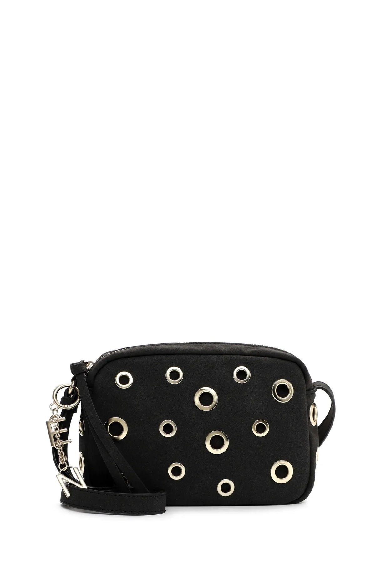 Make a bold statement with this edgy yet elegant graphite cross-body bag, designed to turn heads wherever you go. Featuring a striking gold eyelet embellishment across the front, this compact piece adds a touch of modern glam to any outfit. The silhouette is perfectly sized for your essentials, while the full zip closure keeps everything secure. Finished with a sleek adjustable strap, this bag blends function and fashion effortlessly. Ideal for day-to-night styling, it’s your new go-to for chic urban looks.