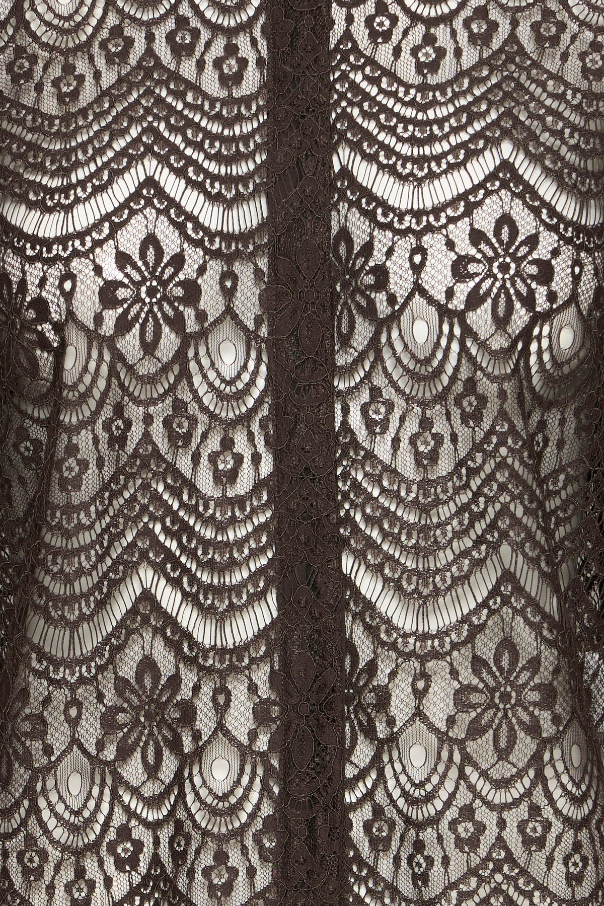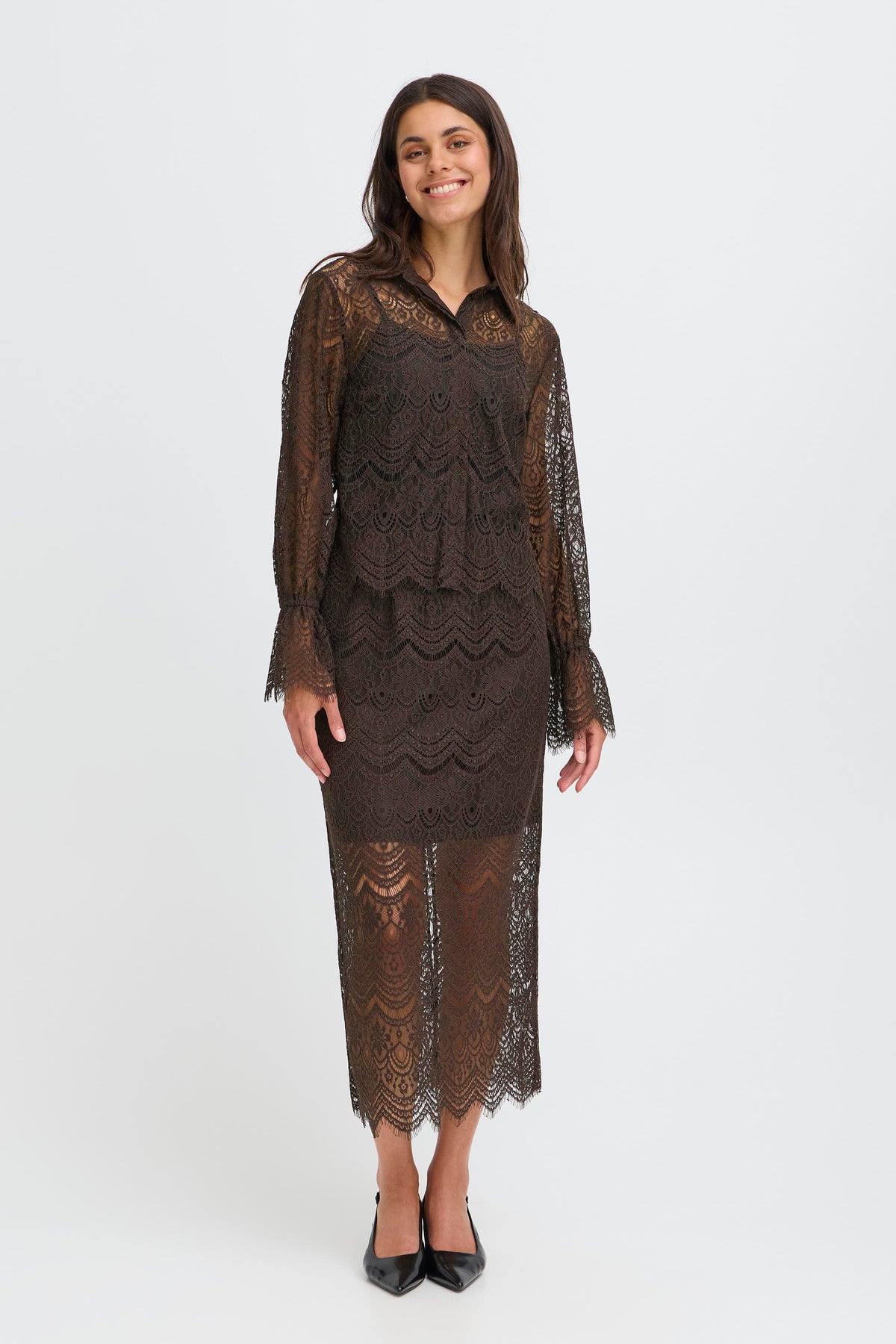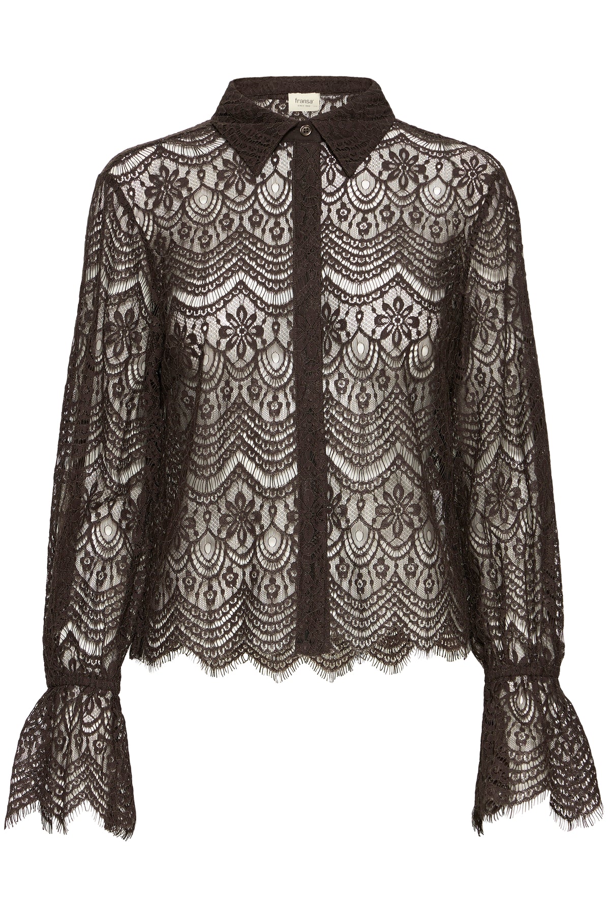 Chocolate brown lace shirt by Fransa with elasticated, scallop edge cuffs and button fastening.