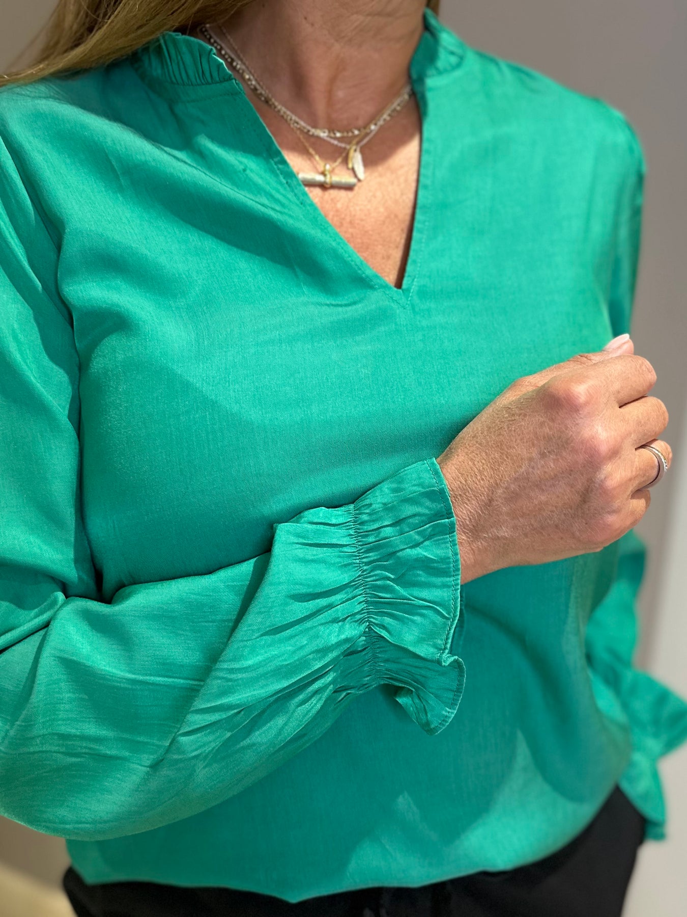 Green blouse by Fransa with ruffle detail to the neck and cuffs, notch v neck and elasticated cuffs.