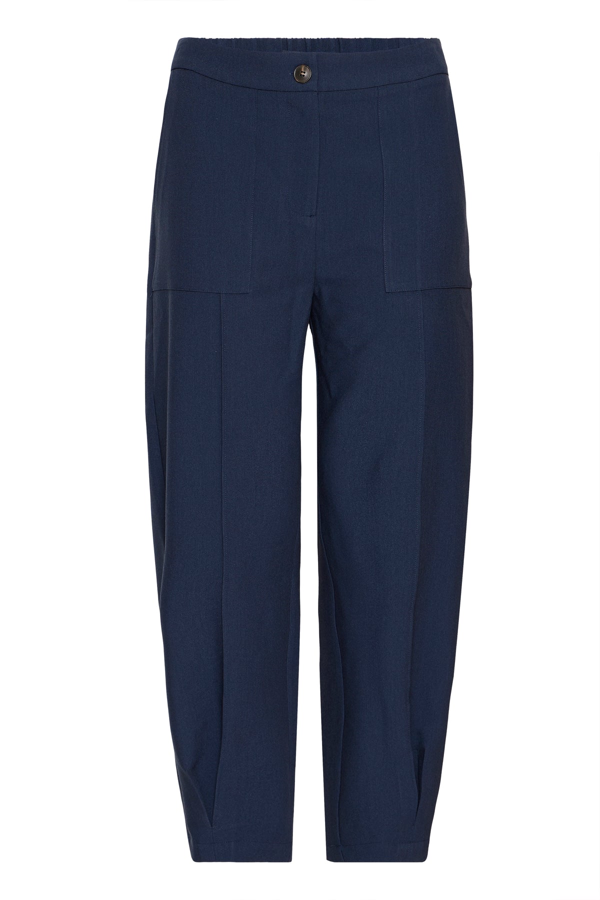 Navy barrel leg smart trousers by Fransa with zip and button fastening, elasticated panel to the back of the waistband and pockets to the front & back.