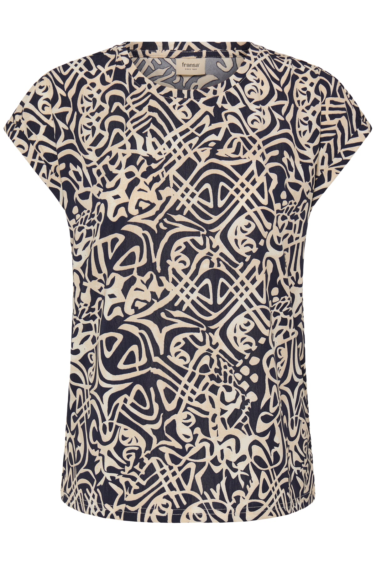 Navy and stone deco lines t-shirt by Fransa with rounded neckline and short sleeves.
