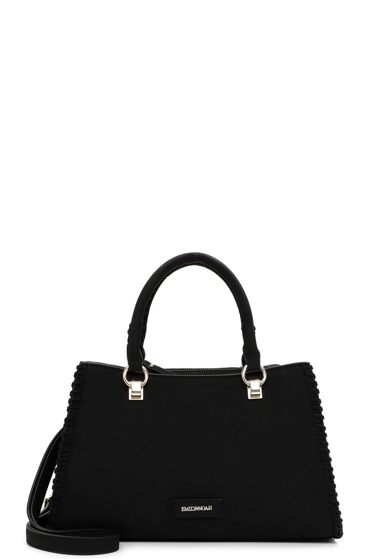 Add a touch of elegance to your everyday style with this sophisticated black handbag. Crafted with a sleek, structured silhouette, it's designed to elevate any outfit - from workwear to weekend chic. The bag features gold tone hardware and a secure zip closure, ensuring your essentials stay safe whilst on the go. The detachable cross-body strap offers versatile styling options - carry by the sturdy top handles for a polished look, or wear it across the body for hands-free convenience. Detailed with subtle stitching along the edges and a modern, minimalist logo plaque, this handbag balances timeless design with contemporary appeal.