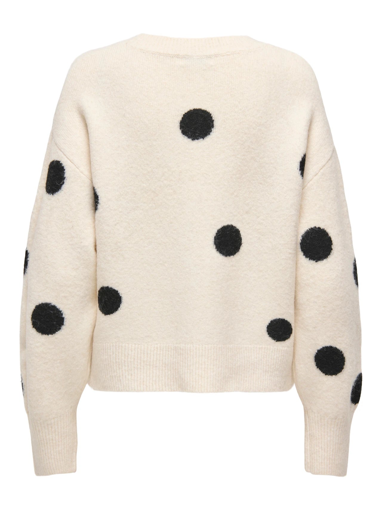 Ecru knit jumper with large black polka dots, rounded neckline and long sleeves. Ribbed edging.