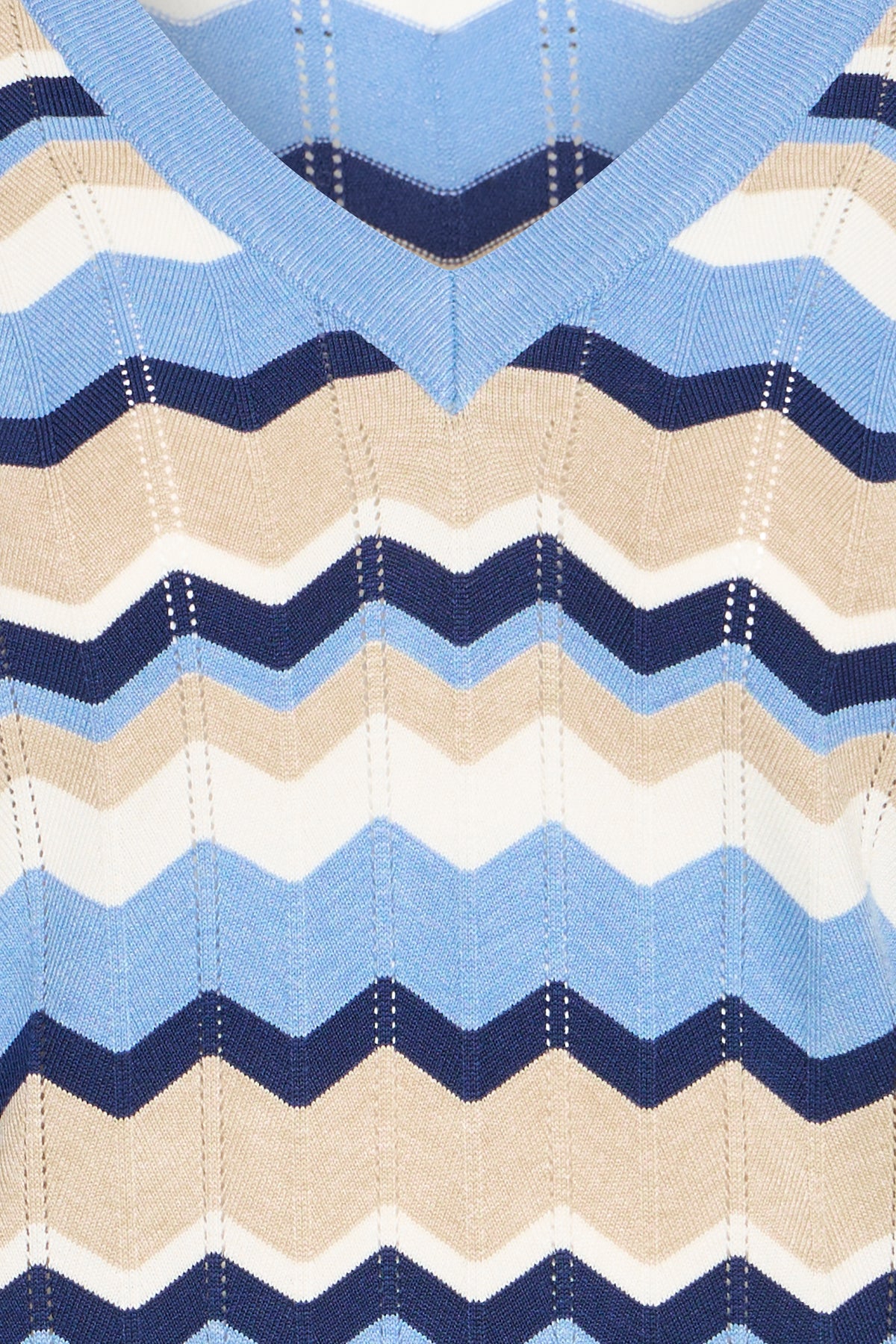 Blue, sand and off white zig-zag stripe lightweight pointelle knit top with v-neck.