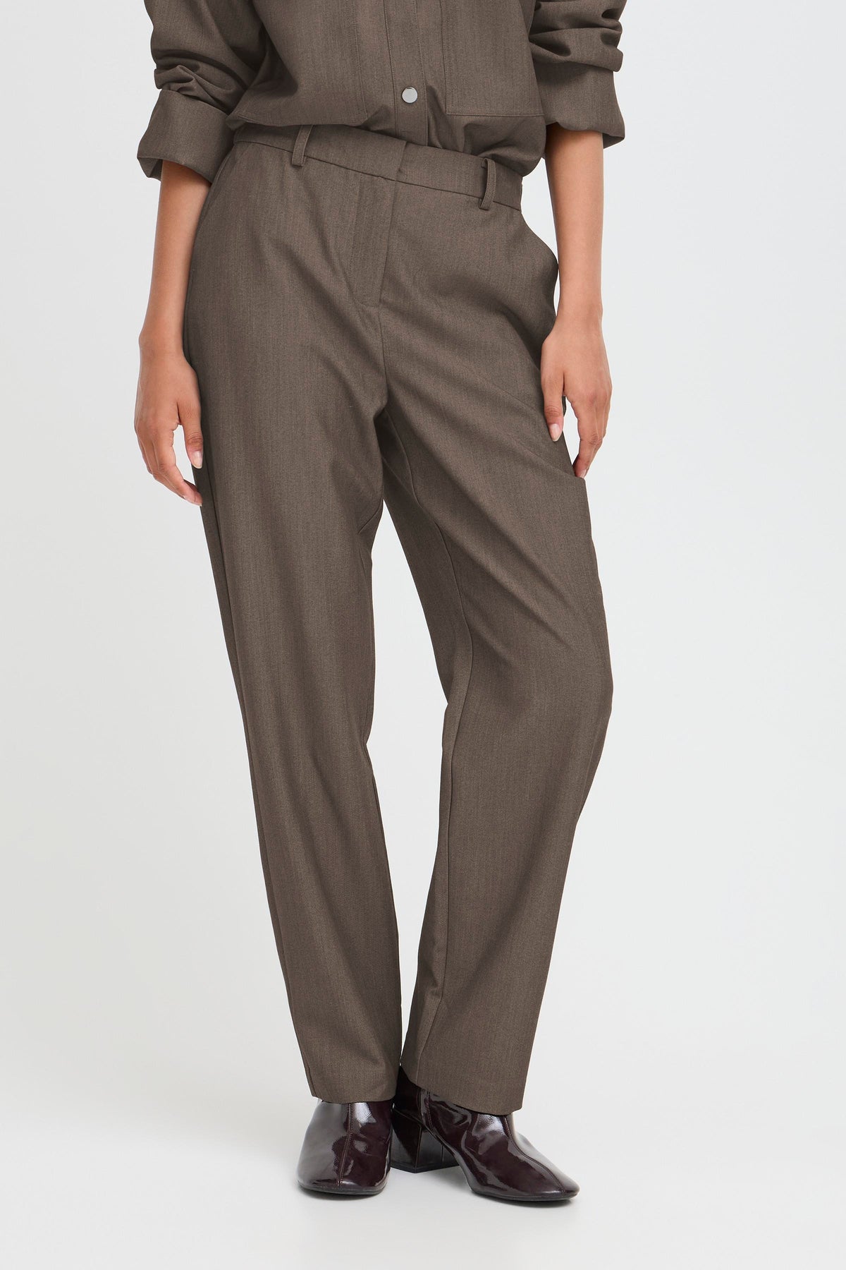 Walnut melange straight leg pants by Byoung with elasticated panel to the back of the waistband, pockets, faux pockets to the back and hook & eye fastening.