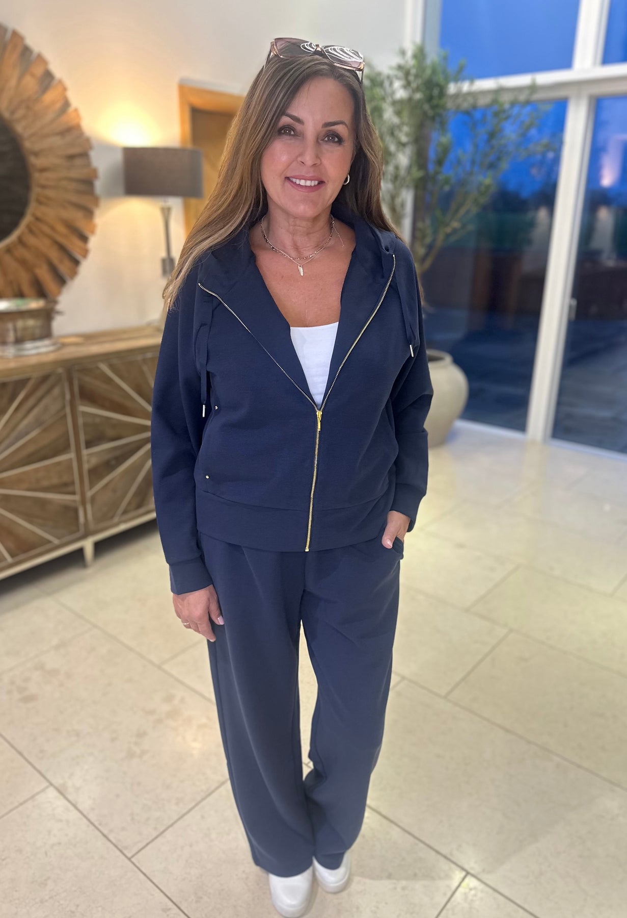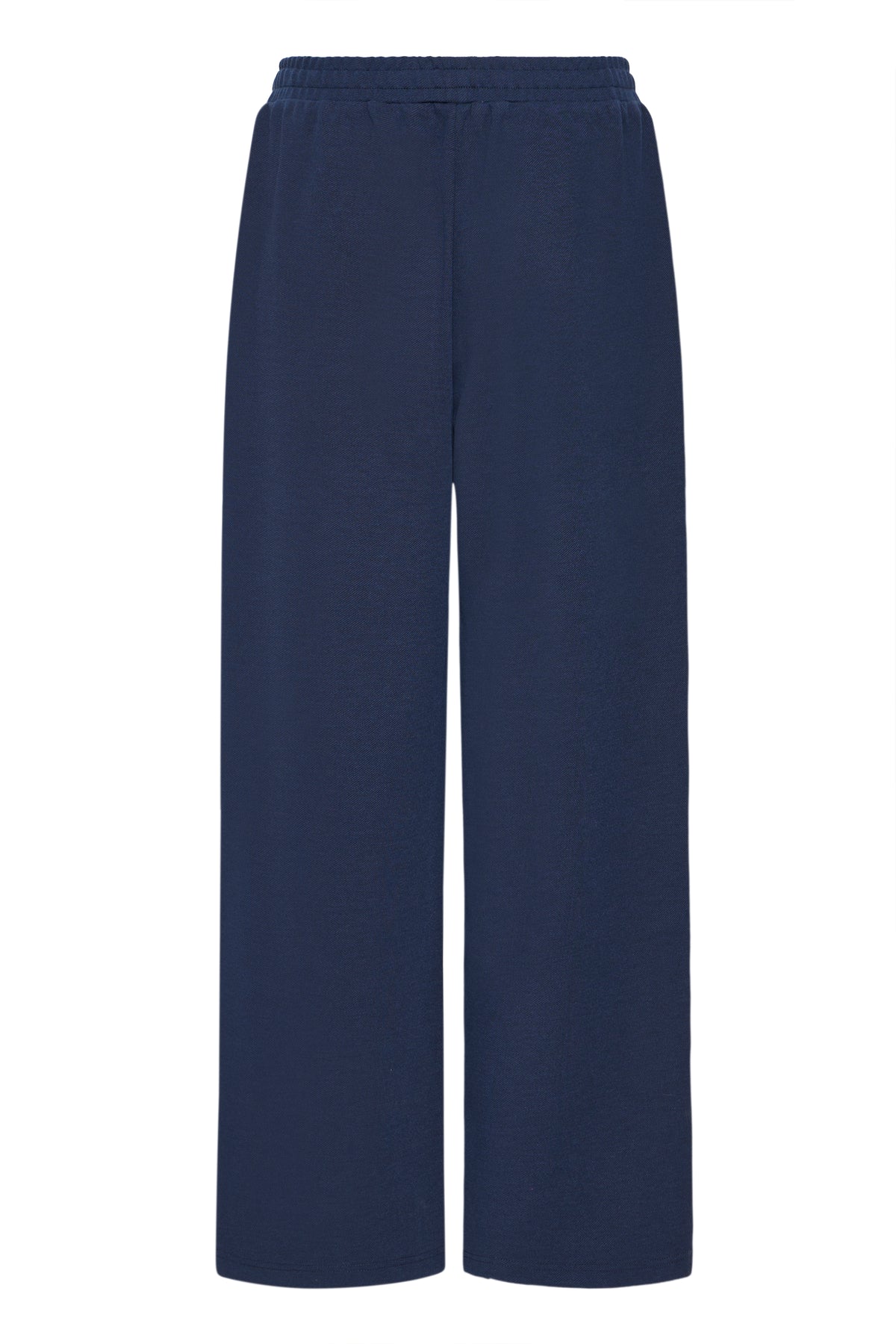 Navy blue joggers with elasticated waistband, wide leg fit and pockets.