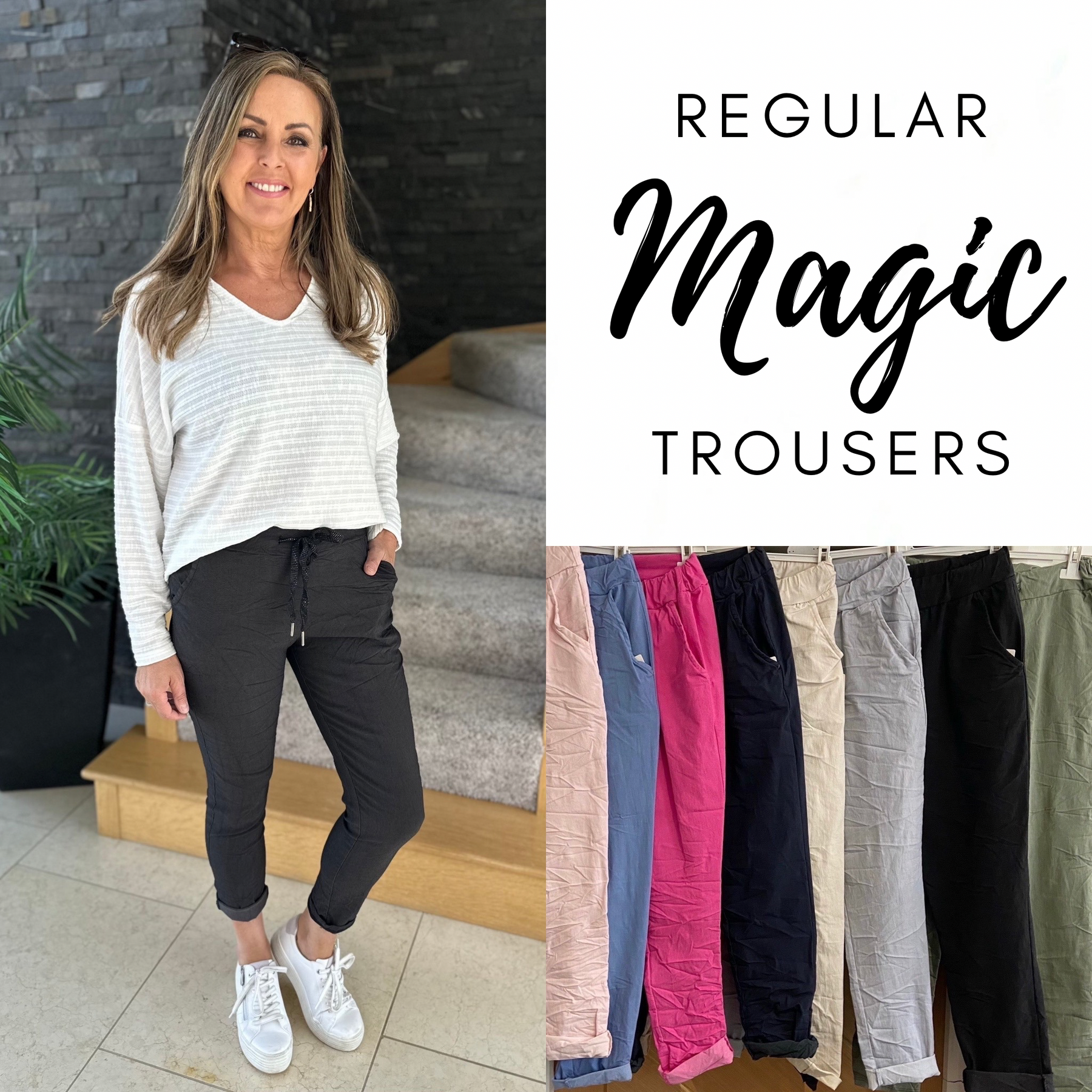 Our all-time best selling product... the super stretchy magic trousers with pockets at the front and drawstring waist. Wear rolled up with trainers/pumps for a very casual look. Comfiest trousers ever!